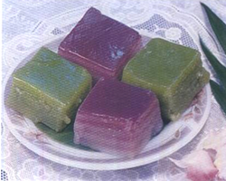 1. คั้นกะทิด้วยน้ำลอยดอกมะลิ ผสมหางกะทิกับน้ำตาลทราย (น้ำเชื่อม) และเกลือตั้งไฟ พอละลายกรอง 2. ผสมแป้งข้าวเจ้า แป้งท้าวยายม่อม แป้งมัน ด้วยหางกะทิ ค่อย ๆ นวด ถ้านวดไม่ได้ ที่ แป้งจะไม่เหนียว ถ้าใช้เครื่องนวดจะดีมาก นวดจนเนียนประมาณ 20 นาที 3. ใส่กะทิที่เหลือจนหมด 4. แบ่งน้ำแป้งออกเป็น 2 ส่วนเท่า ๆ กัน ใส่สีในแป้งให้เป็นสีเข้ม 5. ตั้งลังถึงใส่น้ำประมาณ 3/4 ของรังถึง พอน้ำเดือด ต้องวางถาดบนไม้แบน ในรังถึง เพื่อไอน้ำจะได้ขึ้นได้สะดวก นึ่งถาดให้ร้อน ใส่แป้งสีอ่อนก่อนนึ่งประมาณชั้นละ 5-7 นาที สังเกต ดูแป้งสุกจะใส ชั้นสุดท้ายเทให้หนานึ่ง 10 นาที