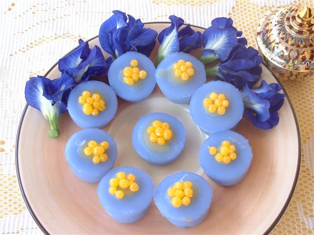 1. ขนมดอกอัญชันคล้ายขนมน้ำดอกไม้แต่ใส่กะทิจึงมัน และนิ่มกว่า 2. ถ้าไม่ใช้หน้าสังขยา อาจใช้หน้าตะโก้ หรือมะพร้าวขูดฝอยเคล้าน้ำเชื่อมและทับด้วย ไข่แมงดา สรุป ดอกอัญชัน ขาวดอกมะลิ 105 (อมิโลสต่ำ)