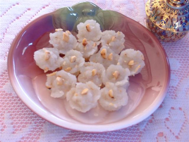 1. ผสมน้ำตาลทราย กะทิ 200 กรัม และเกลือ คนให้ละลายบนไฟกลาง พอละลายยกลงกรอง 2. แป้งข้าวเจ้าและแป้งถั่วผสม นวดเล็กน้อยกับกะทิที่เหลือจนหมด นำส่วนผสมในข้อ 1 มาผสม ด้วยกันจนหมด 3. ตั้งไฟกลางกวนจนขนมข้น ลดไฟอ่อน ใส่ถั่วลิสง กวนต่อจนเหนียว ยกลงแช่กระทะในน้ำเย็น 4. ปั้นขนม น้ำหนักแป้ง 5 กรัม ใช้ปากคีบจับขนมและจีบ 4 กลีบ เสียบตรงกลางด้วยถั่วลิสงคั่วหั่น หรือเม็ดแตงโมแกะเปลือก เหมือนยอดมงกุฎ