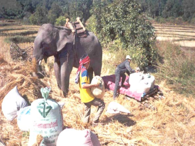 เมล็ดและบรรจุลงกระสอบ ๆ ละประมาณ 25-30 กิโลกรัม เก็บผลผลิตเข้ายุ้งฉางโดยใช้แรงงานคน แรงงานสัตว์ (วัว ช้าง) ปัจจุบันมีการใช้รถมอเตอร์ไซค์ หรือรถยนต์บรรทุก ชาวกะเหรี่ยงบางรายคัดเลือกกระทงนาที่ข้าวเจริญเติบโตดี เมล็ดสมบูรณ์ รอให้สุกแก่เต็มที่จึงจะเก็บเกี่ยวเมล็ดไว้ทำพันธุ์ บางรายปลูกข้าวมากกว่า 2 พันธุ์ จะแยกเมล็ดพันธุ์เก็บไว้ต่างหาก ที่เหลือจะนำมาปนกันเพื่อเก็บไว้บริโภค