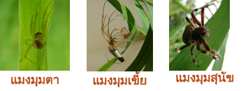 - แมงมุม ที่พบในข้าวมีหลายชนิด มีบทบาทสำคัญช่วยควบคุมแมลงศัตรูข้าว โดยจับกินผีเสื้อหนอนกอข้าว เพลี้ยจักจั่นสีเขียว เพลี้ยกระโดดและมวนศัตรูข้าว