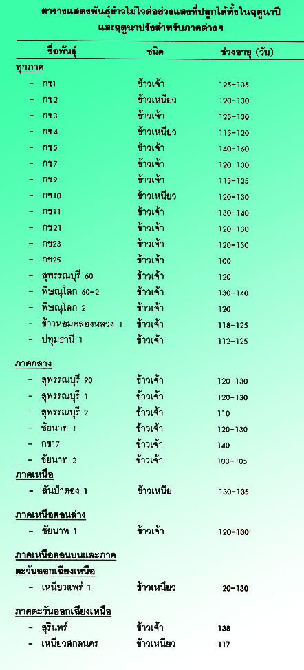 พันธุ์ข้าวที่ทางราชการส่งเสริมให้เกษตรกรปลูกอยู่ทุกวันนี้ สามารถแบ่งออกตามลักษณะการตอบสนองต่อช่วงแสงได้เป็น 2 พวกใหญ่ ๆ ดังนี้