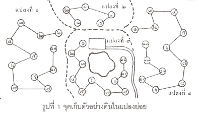 2. จำนวนหลุมที่เจาะในแปลงหนึ่ง ๆ นั้นในพื้นที่ 5-10 ไร่ ควรเจาะประมาณ 10 หลุมกระจายให้ทั่วใส่ในถึงพลาสติก แล้วรวมเป็น 1 ถุง น้ำหนักประมาณ 1 กิโลกรัม ดังแผนผังที่แสดง ดังรูปที่ 1