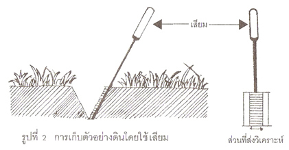 ในกรณีที่ใช้เสียมหรือจอบ ให้ขุดหลุมเป็นรูปตัววี (V) ขนาดความกว้างเท่ากับหน้าจอบ/เสียม ลึกประมาณ 15 เซ็นติเมตร นำดินในหลุมออกให้หมดเอาปลายจอบ/เสียมวางลงที่ขอบหลุมด้านใดด้านหนึ่ง ที่มีหน้าตัดเรียบห่างจากขอบหลุมประมาณ 2 เซ็นติเมตร กดปลายจอบ/เสียมโดยแรง ให้ลึกประมาณ 15 เซ็นติเมตร แล้วงัดขึ้นมา หน้าดินจะติดมากับหน้าจอบ/เสียม ใช้มีดตัดดิน 2 ส่วนด้านข้างออก เหลือไว้แต่ตรงกลางประมาณ 3 เซ็นติเมตร (รูปที่ 2) แล้วใส่ถังพลาสติกที่สะอาดปราศจากปุ๋ยเคมีหรือสารเคมีต่าง ๆ หลังจากเก็บทุกหลุมแล้ว ควรคลุกเคล้าให้เข้ากันดี เพื่อจะได้เป็นตัวแทนของดินในพื้นที่นั้น ๆ แล้วเก็บตัวอย่างดินใส่ถุงพลาสติกประมาณ 1 กิโลกรัม มัดปากถุงให้แน่นก่อนส่งไปวิเคราะห์