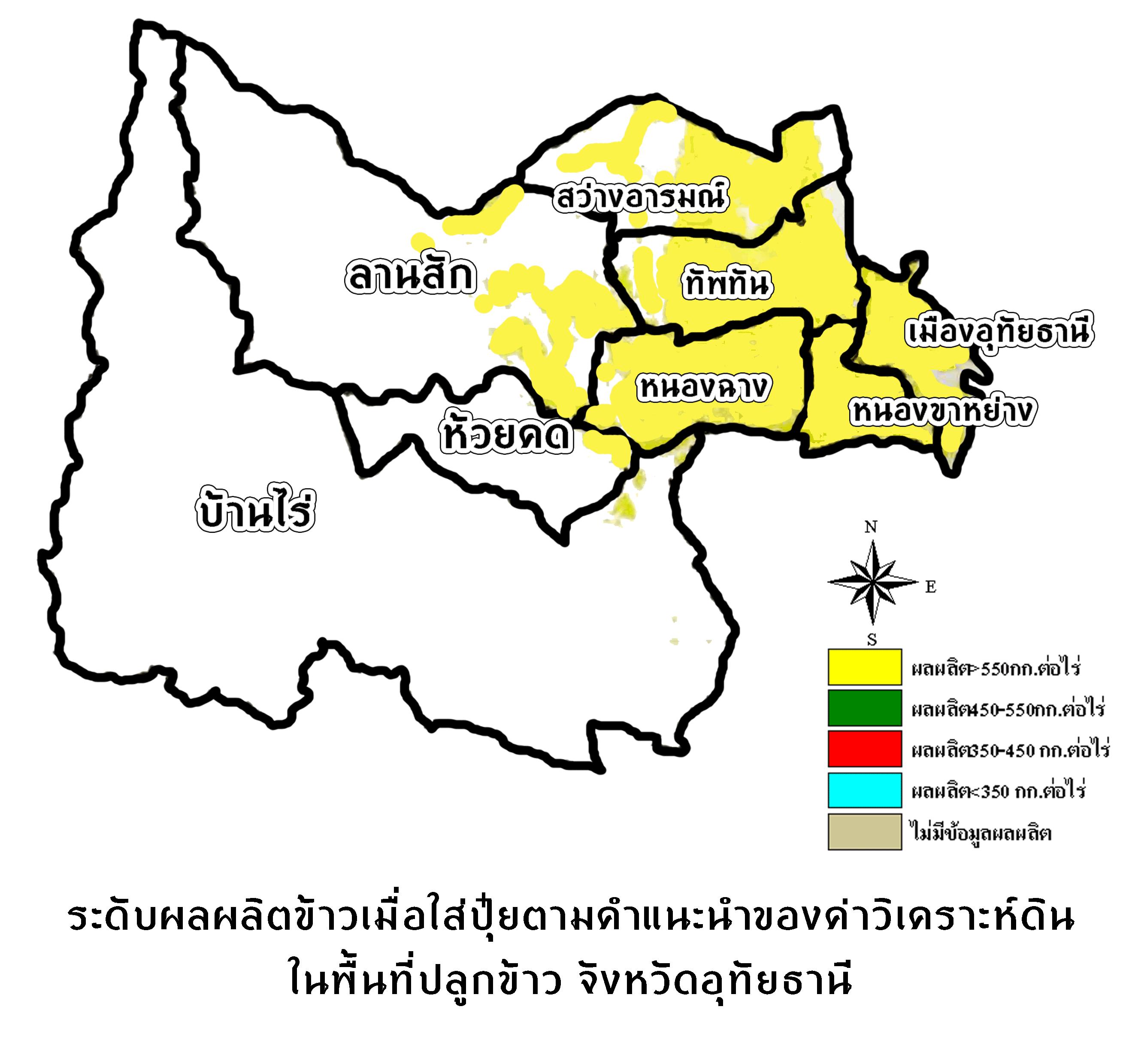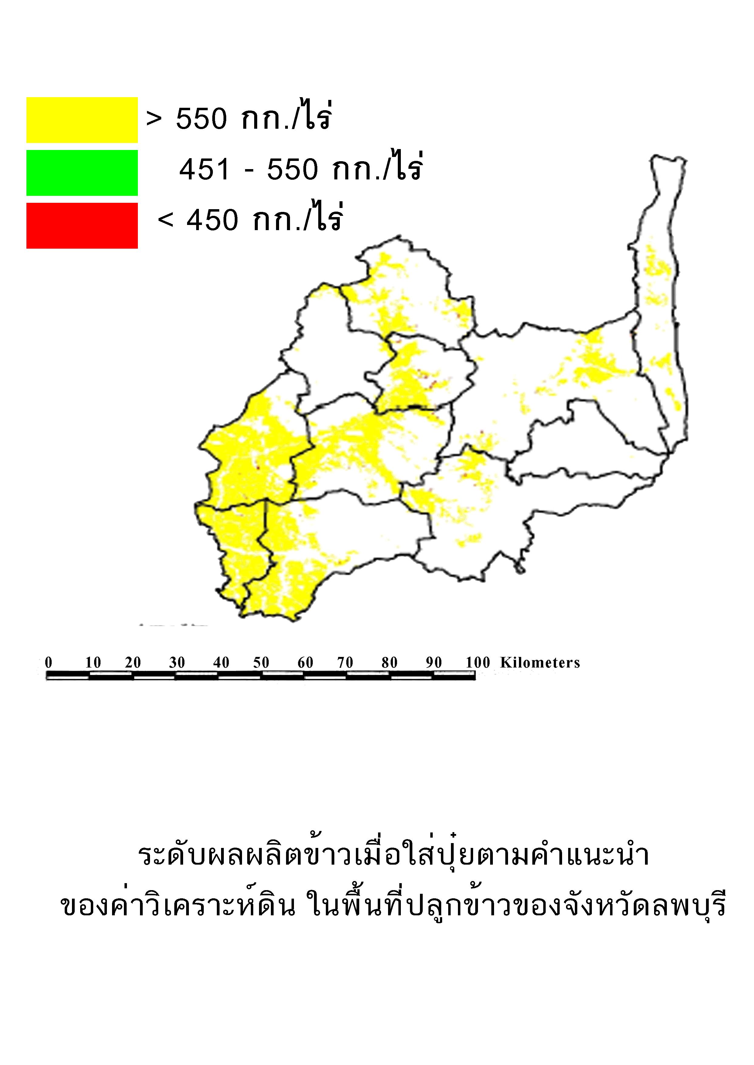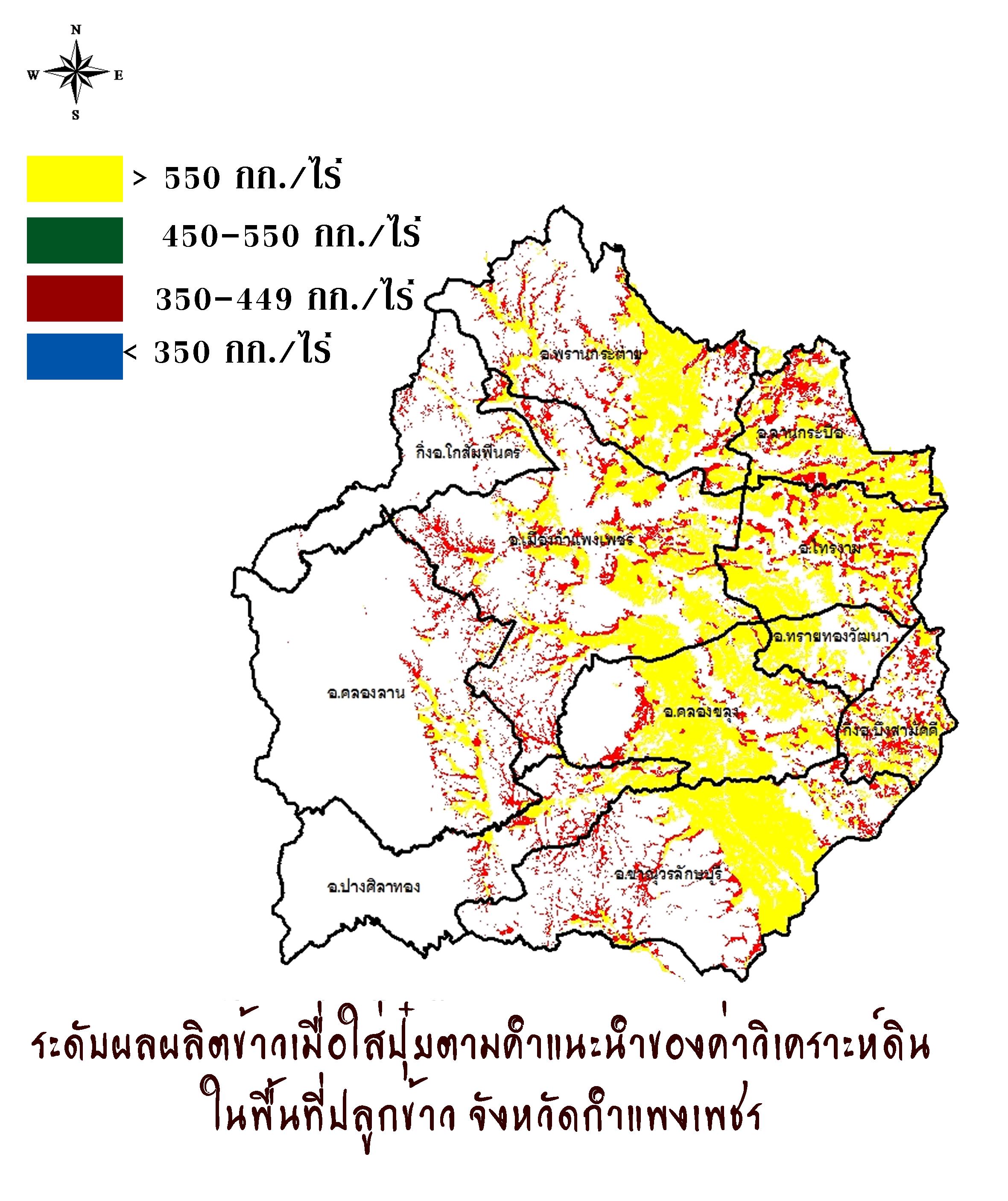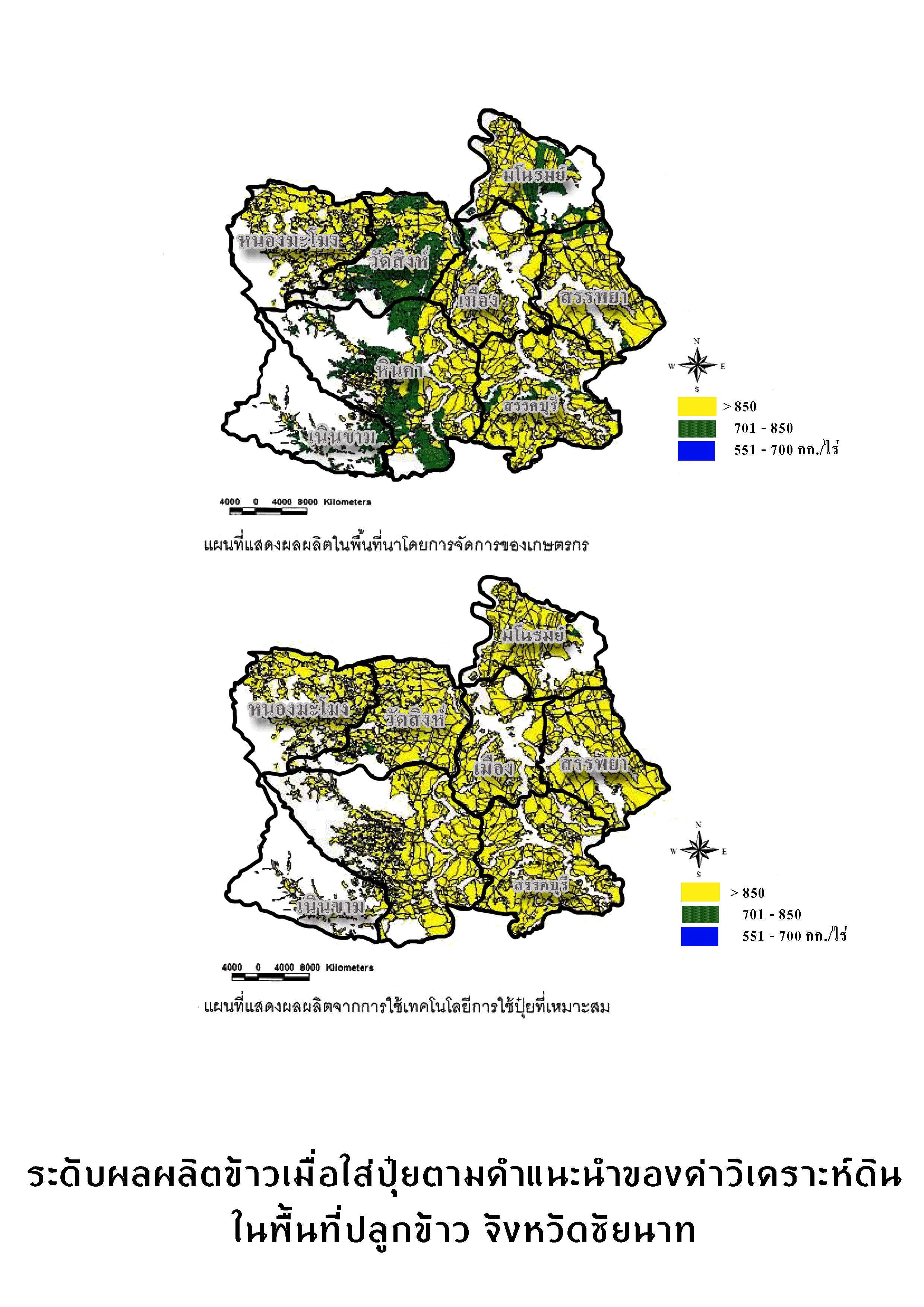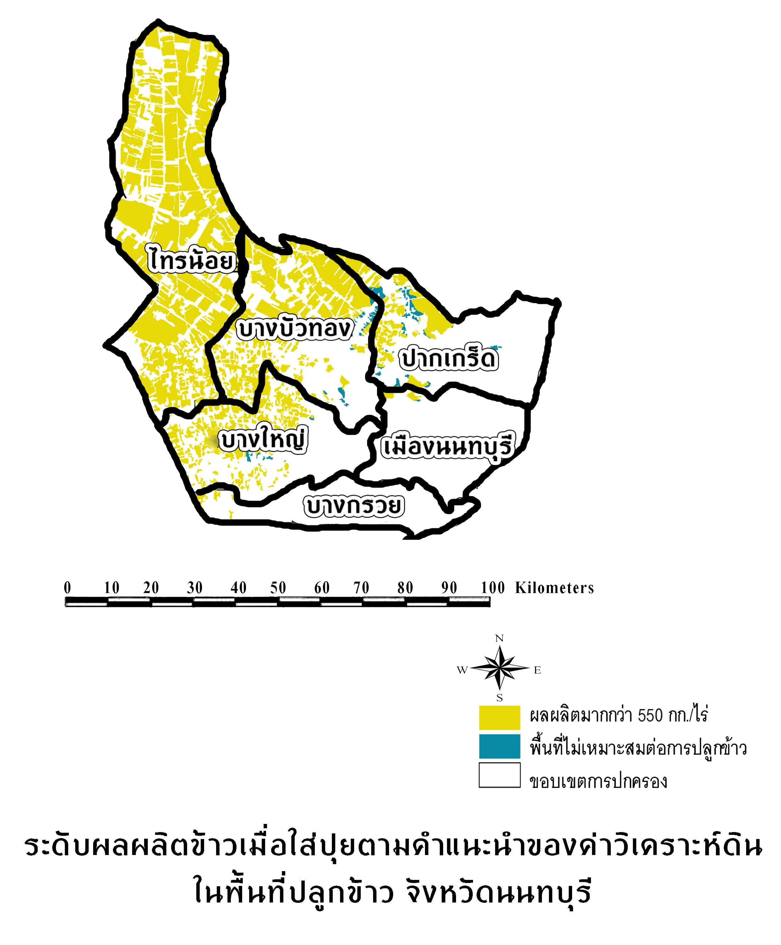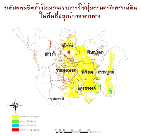 การใช้เทคโนโลยีการใส่ปุ๋ยเคมีที่ถูกต้องและเหมาะสม สามารถเพิ่มศักยภาพการผลิตข้าว โดยรวมได้ยกระดับผลผลิตข้าวของจังหวัดนครนายก ให้สูงขึ้นประมาณ ร้อยละ 37 โดยในเขตชลประทาน จากระดับที่ 2 คือ ผลผลิต 450-550 กิโลกรัมต่อไร่ และระดับที่ 1 คือ มากกว่า 550 กิโลกรัมต่อไร่ เป็น มากกว่า 700 กิโลกรัมต่อไร่ และเพิ่มพื้นที่ที่ให้ผลผลิตมากกว่า 550 กิโลกรัมต่อไร่ ได้มากขึ้น ส่วนพื้นที่อาศัยน้ำฝน สามารถยกระดับศักยภาพการผลิต จากระดับที่ 2 เป็นระดับที่ 1 และปรับผลิตระดับที่ 4 ให้เป็นระดับที่ 2 ได้ ในเขตที่สามารถหาแหล่งน้ำเพิ่มเติมได้ ตามสัดส่วนของพื้นที่
