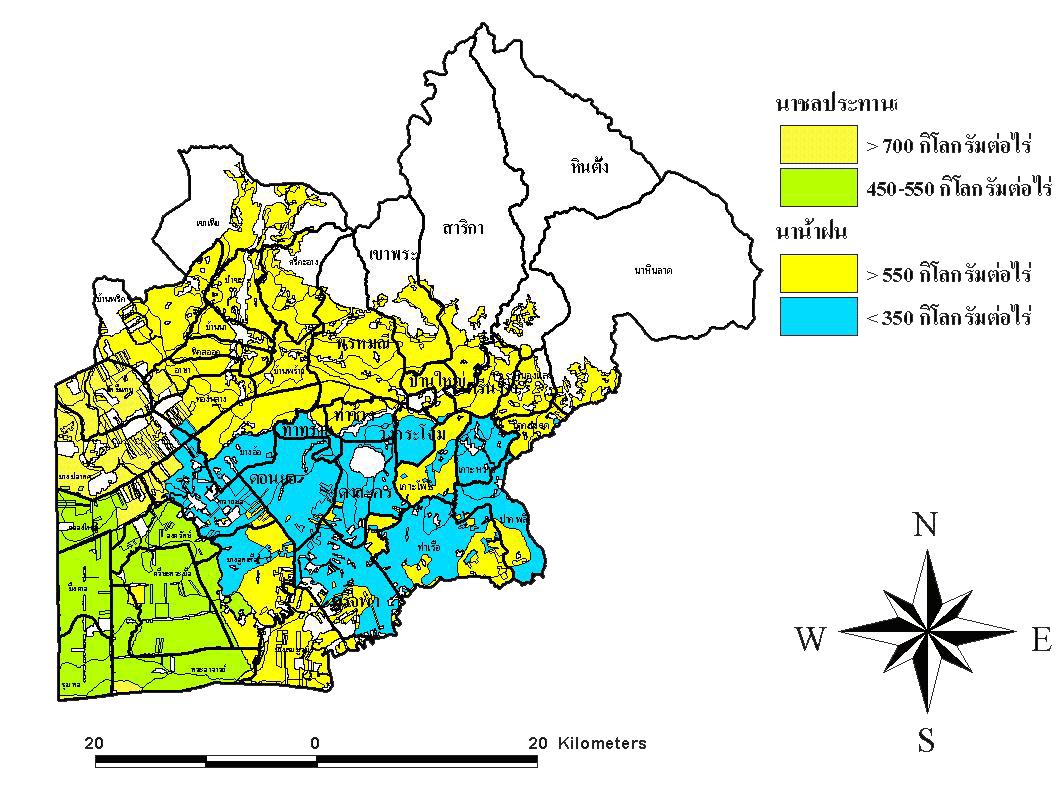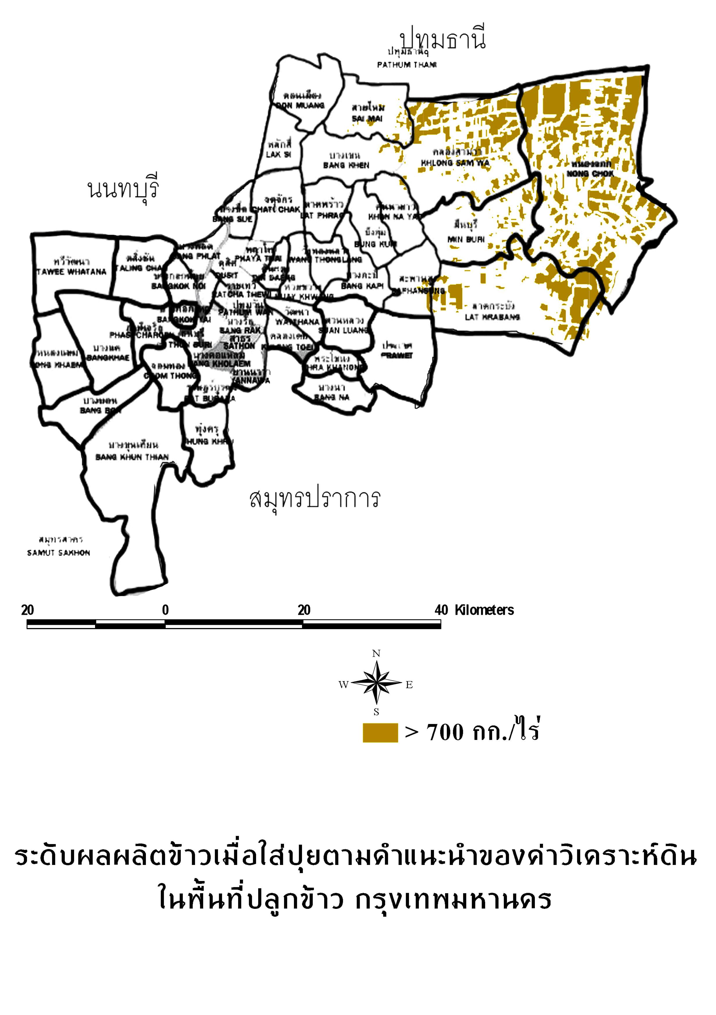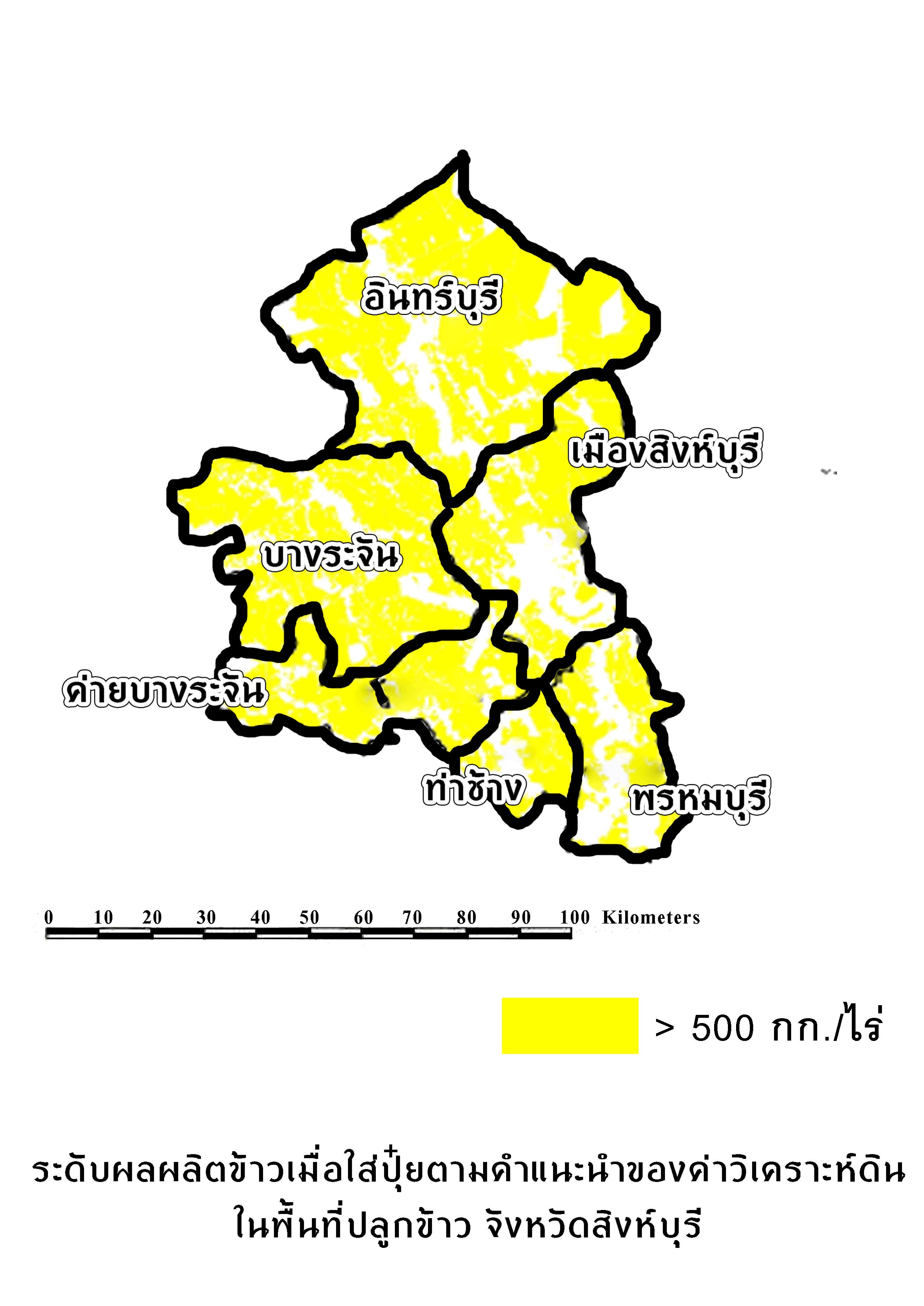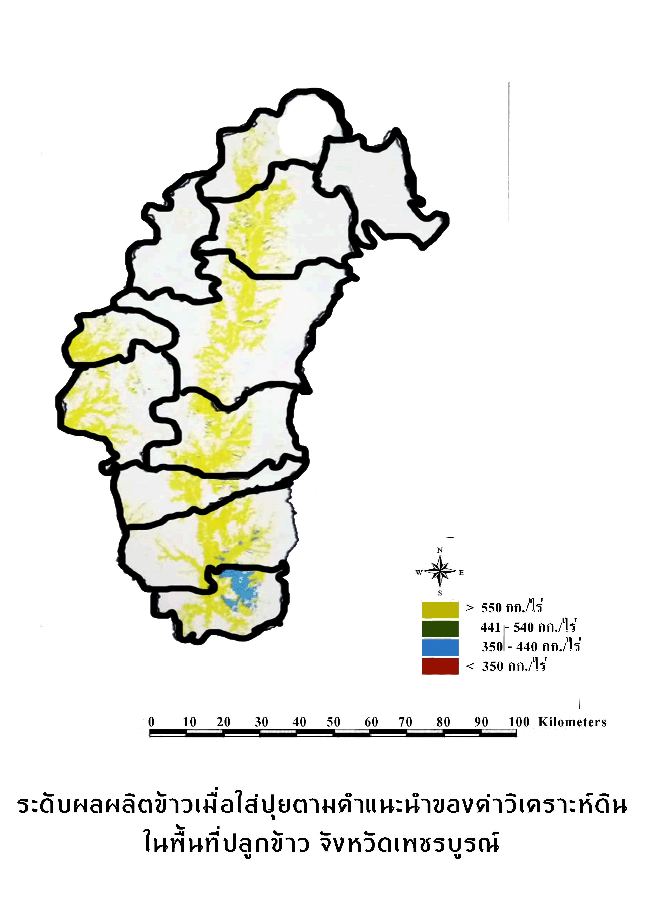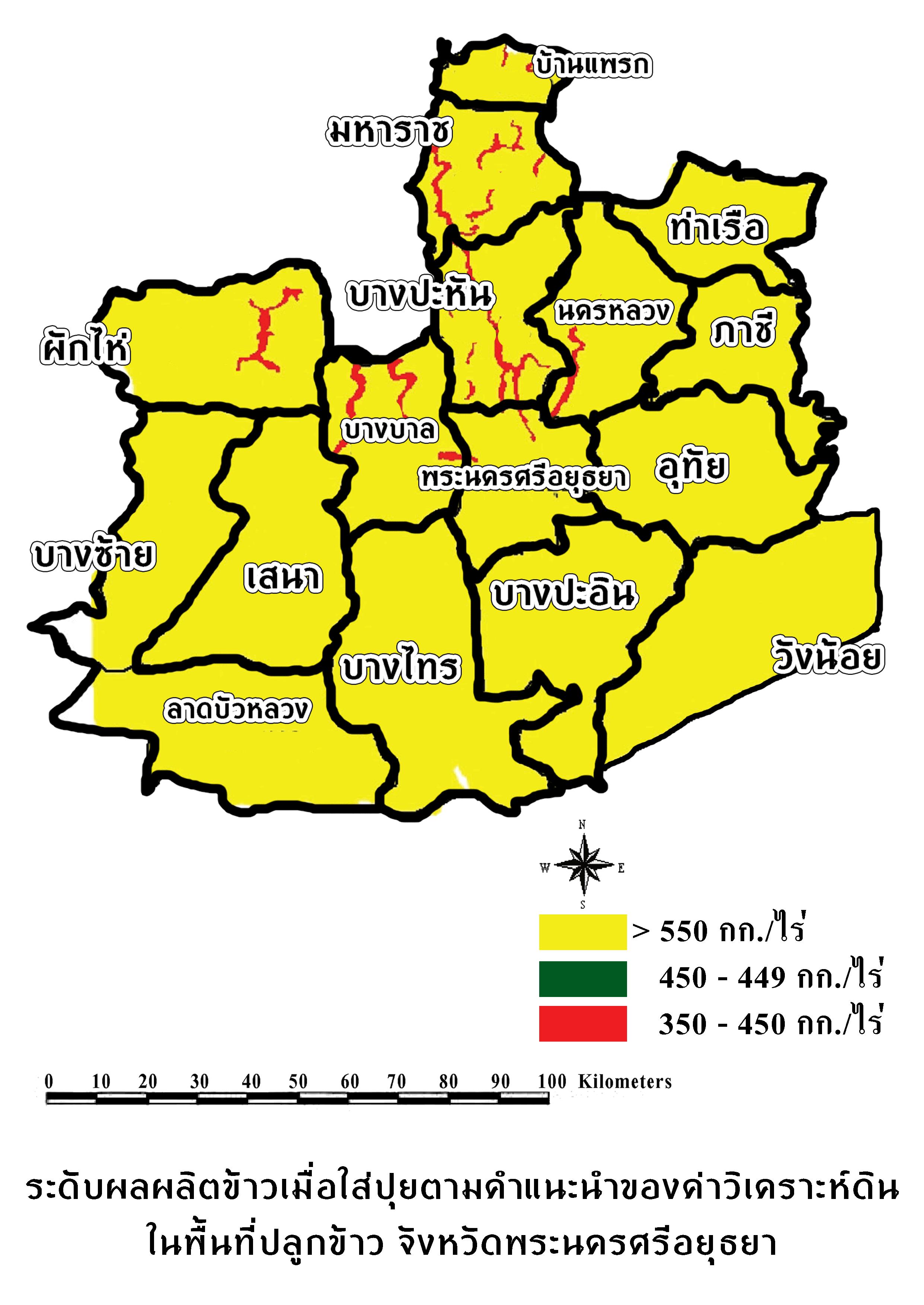 การใช้เทคโนโลยีการใส่ปุ๋ยเคมีที่ถูกต้องและเหมาะสม สามารถเพิ่มศักยภาพการผลิตข้าว โดยรวมได้ยกระดับผลผลิตข้าวของจังหวัดนครนายก ให้สูงขึ้นประมาณ ร้อยละ 37 โดยในเขตชลประทาน จากระดับที่ 2 คือ ผลผลิต 450-550 กิโลกรัมต่อไร่ และระดับที่ 1 คือ มากกว่า 550 กิโลกรัมต่อไร่ เป็น มากกว่า 700 กิโลกรัมต่อไร่ และเพิ่มพื้นที่ที่ให้ผลผลิตมากกว่า 550 กิโลกรัมต่อไร่ ได้มากขึ้น ส่วนพื้นที่อาศัยน้ำฝน สามารถยกระดับศักยภาพการผลิต จากระดับที่ 2 เป็นระดับที่ 1 และปรับผลิตระดับที่ 4 ให้เป็นระดับที่ 2 ได้ ในเขตที่สามารถหาแหล่งน้ำเพิ่มเติมได้ ตามสัดส่วนของพื้นที่