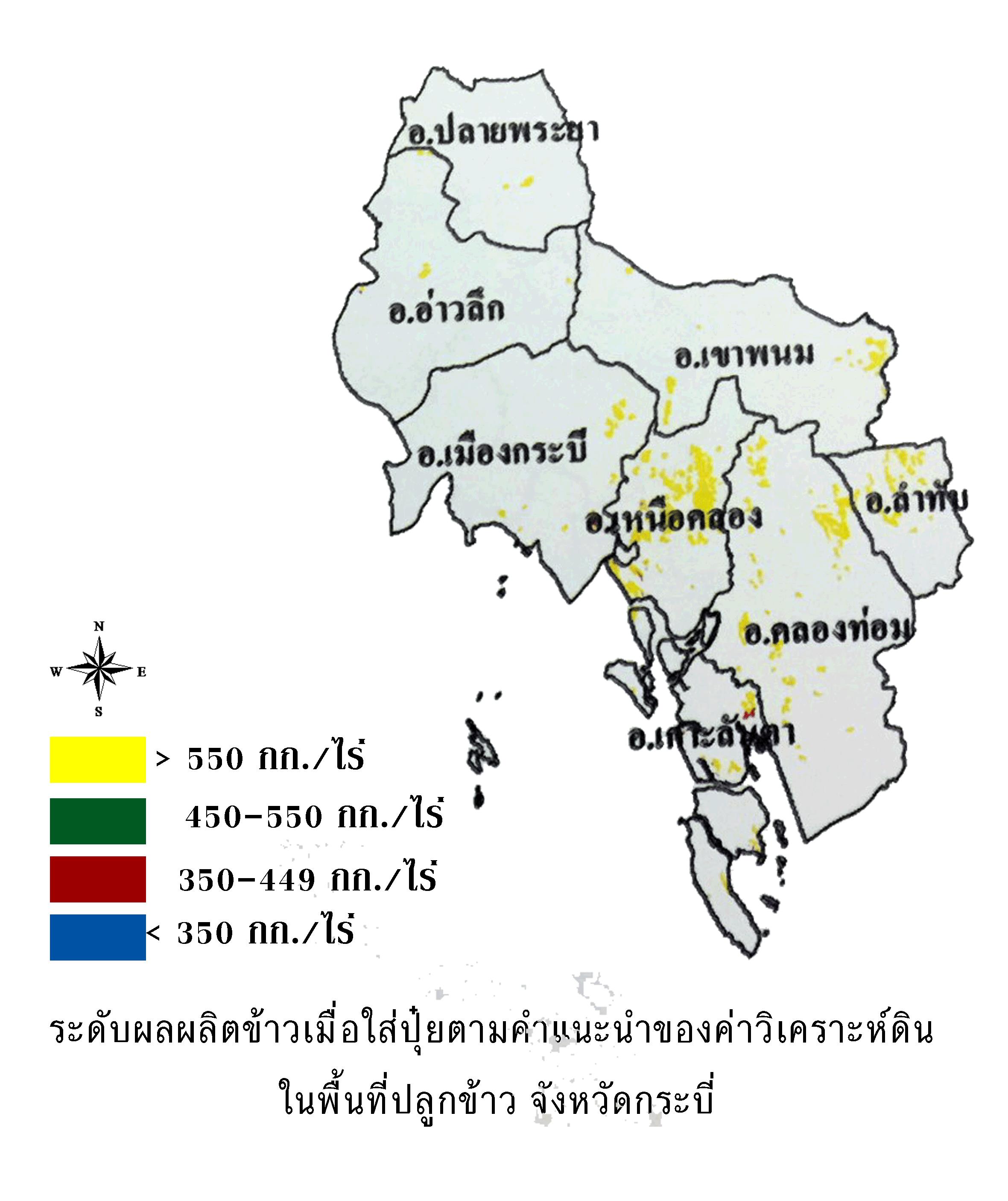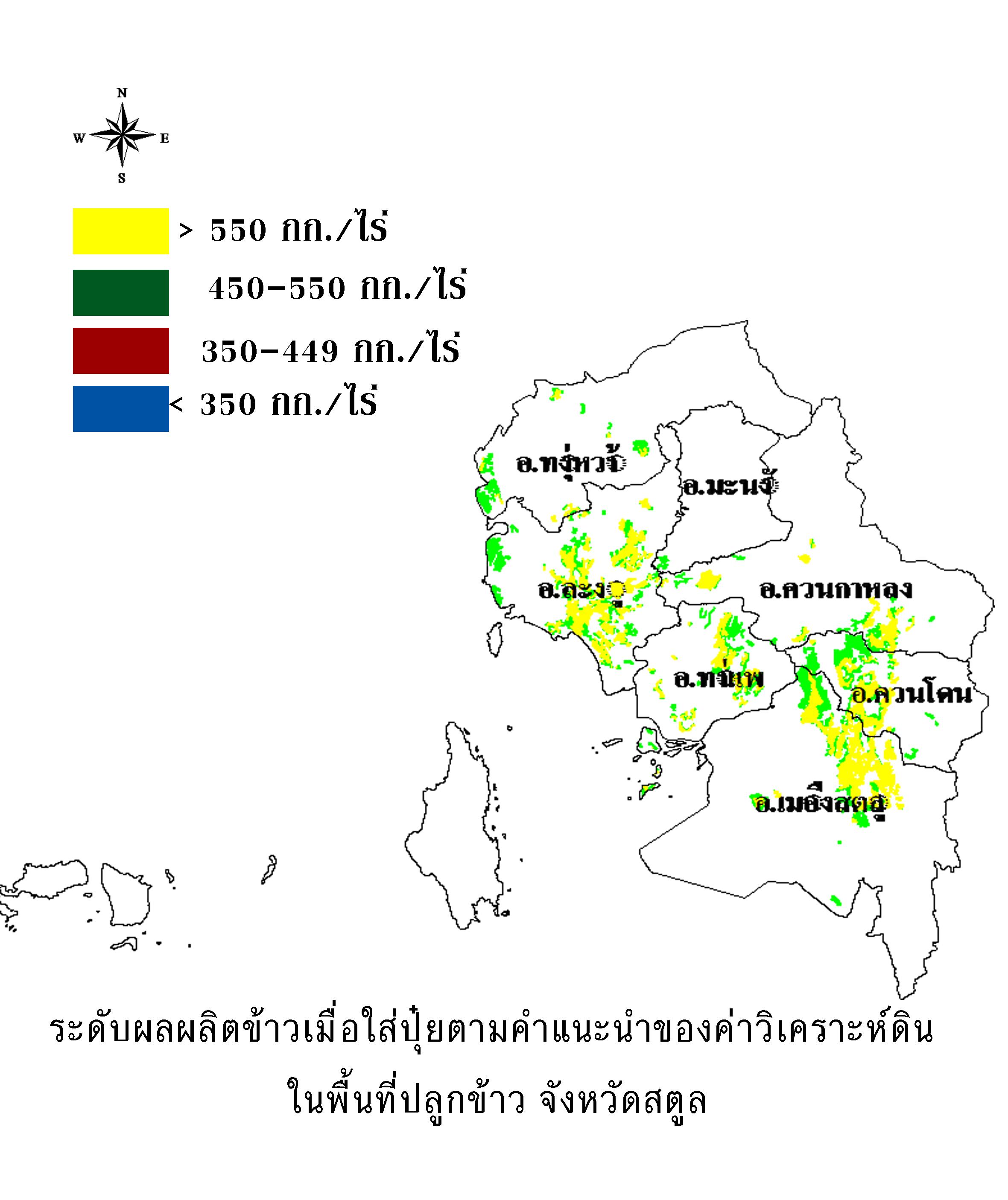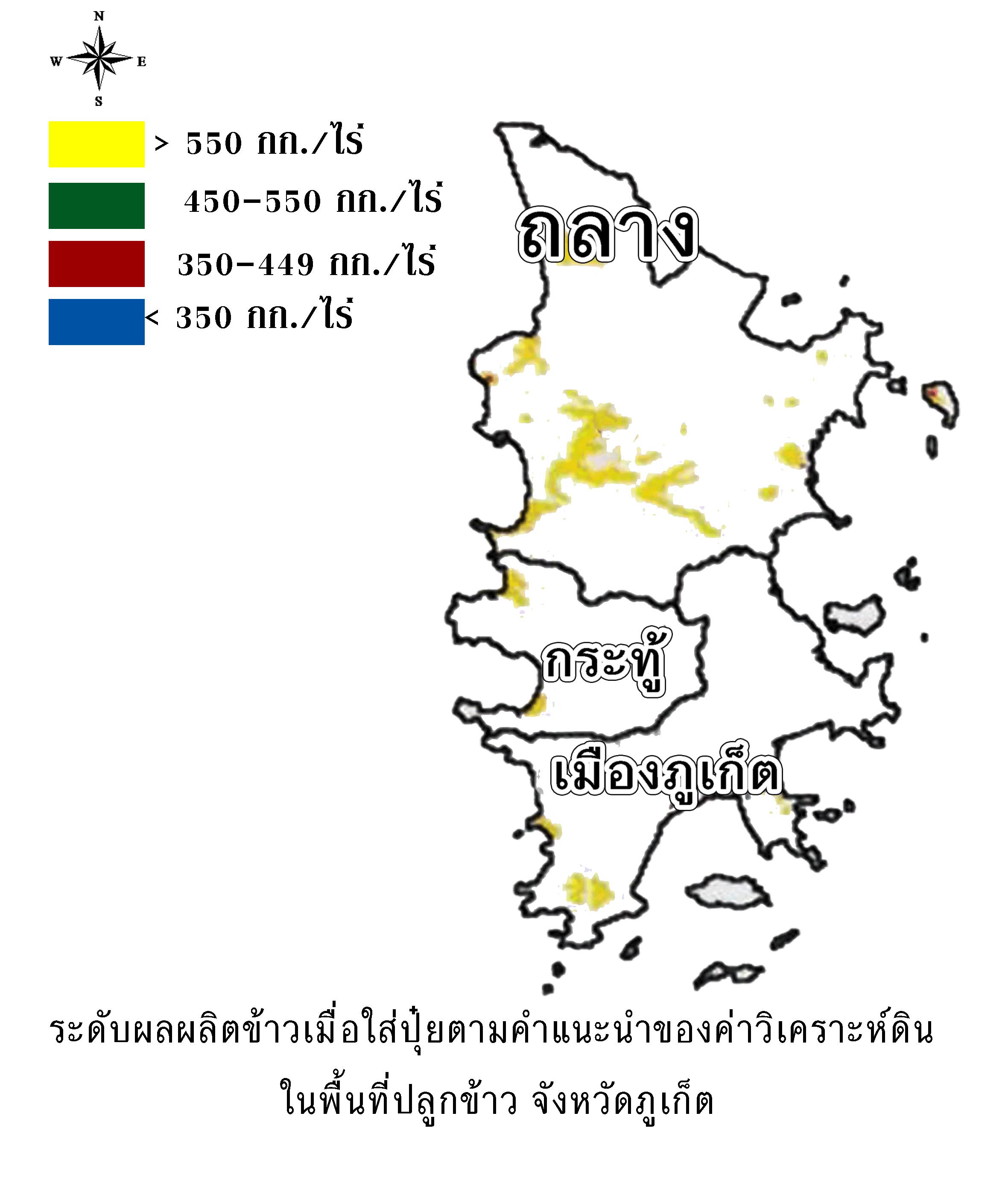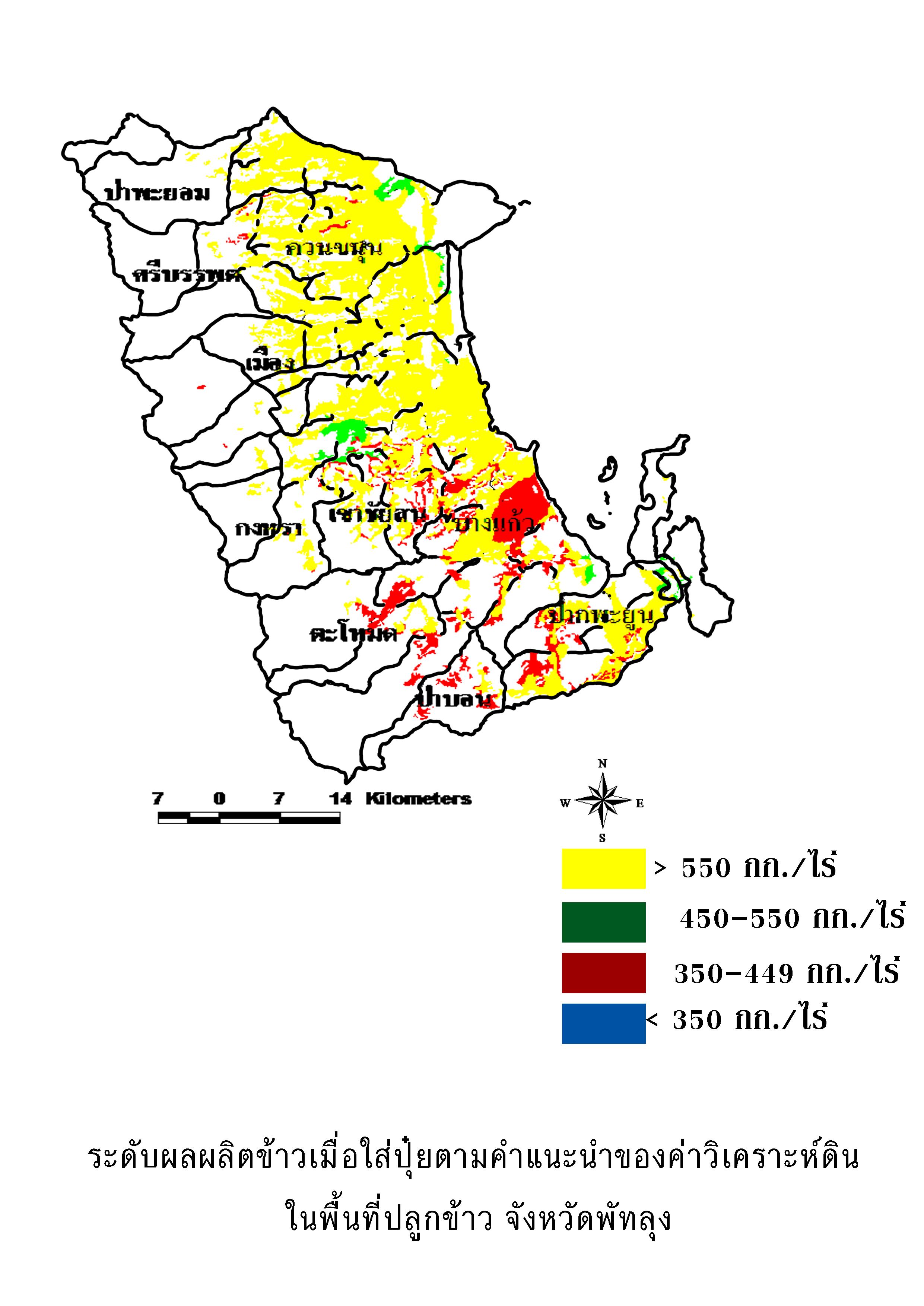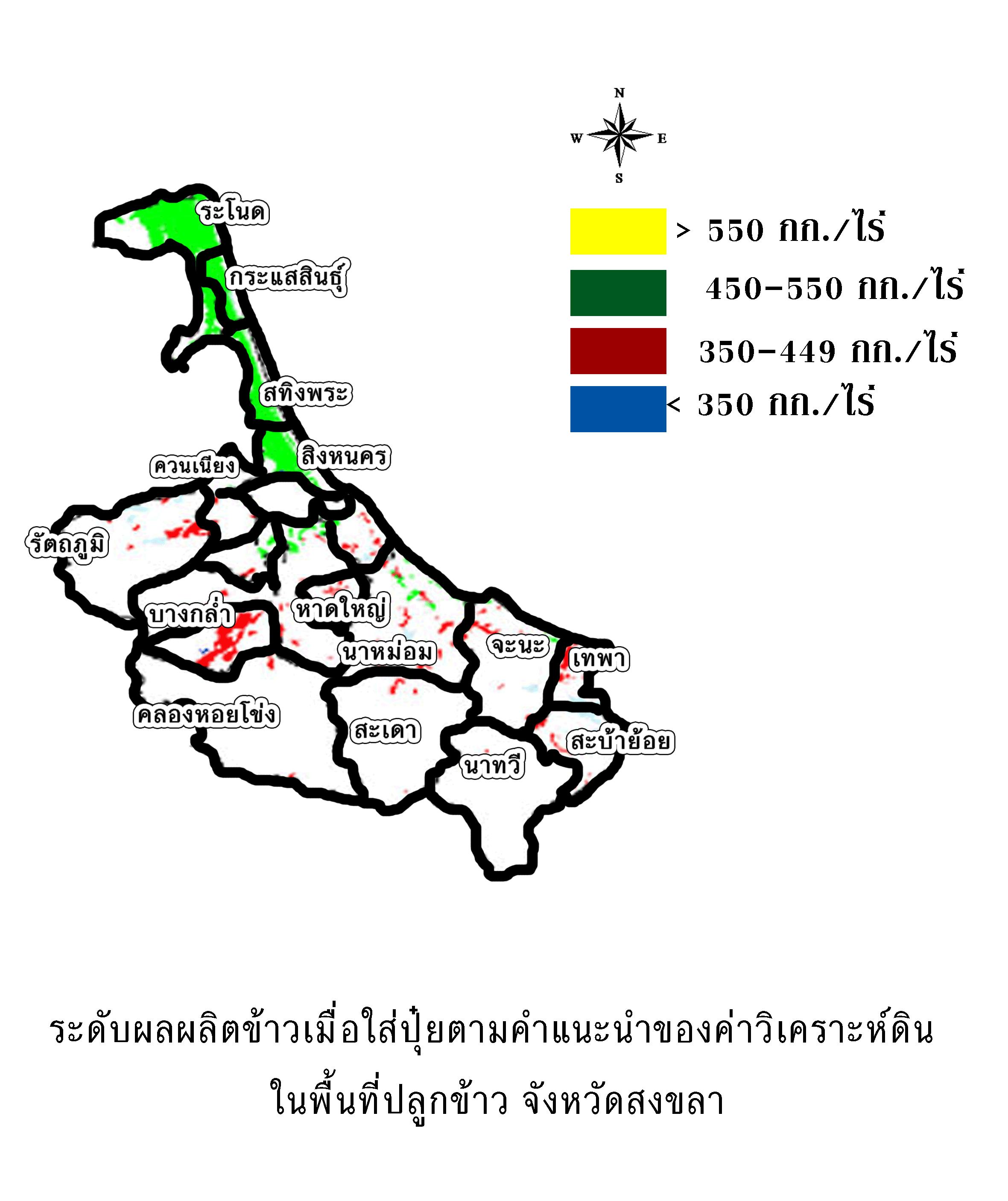 การใช้เทคโนโลยีการใส่ปุ๋ยเคมีที่ถูกต้องและเหมาะสม ด้วยการทำแปลงทดสอบการใช้ปุ๋ยตามคำแนะนำ และตามค่าวิเคราะห์ดิน เปรียบเทียบกับการใช้ปุ๋ยของเกษตรกร ระหว่าง พ.ศ. 2546-2548 สามารถเพิ่มศักยภาพการผลิตข้าว โดยรวมได้ยกระดับผลผลิตข้าวในพื้นที่เหมาะสมมากของจังหวัดสงขลา ให้สูงขึ้นประมาณ 10 กิโลกรัมต่อไร่ กิโลกรัมต่อไร่ โดยการใส่ปุ๋ยตามคำแนะนำ ให้ผลผลิตข้าวสูงสุด 651 กิโลกรัมต่อไร่