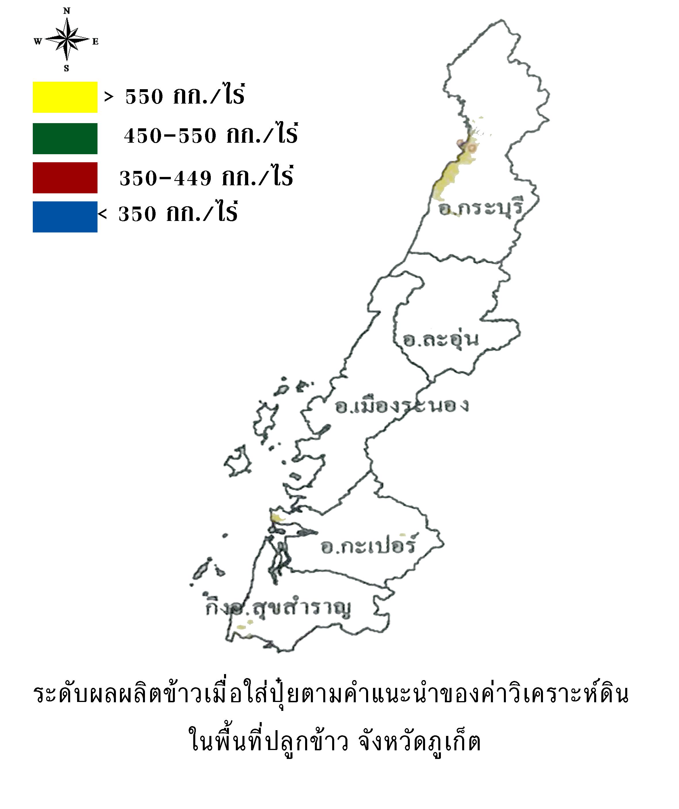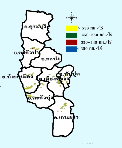 พันธุ์ข้าวที่เกษตรกรนิยมปลูกส่วนใหญ่ใช้พันธุ์พื้นเมือง เล็บนกปัตตานี และดอกพะยอม พื้นที่ส่วนใหญ่เป็นพื้นที่นาน้ำฝน แถบอำเภอกระบุรี ส่วนใหญ่มีความเหมาะสมมากต่อการปลูกข้าวมาก และบางส่วนไม่เหมาะสมต่อการปลูกข้าว ในสัดส่วนใกล้เคียงกัน การใช้เทคโนโลยีที่เหมาะสมให้ผลผลิตข้าวได้มากกว่า 550 กิโลกรัมต่อไร่