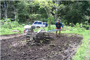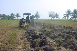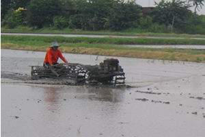 | 2. การคราดหรือใช้ลูกทุบ คือการกำจัดวัชพืช ตลอดจนการทำให้ดินแตกตัว และเป็นเทือกพร้อมที่จะปักดำได้ ขั้นตอนนี้เป็นขั้นตอนที่ทำต่อจากขั้นตอนที่ 1 และขังน้ำไว้ระยะหนึ่ง เพื่อให้มีสภาพดินที่เหมาะสมในการคราด การใช้ลูกทุบหรือเครื่องไถพรวนจอบหมุน(Rotary) |