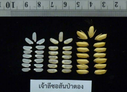 เมล็ดข้าวเปลือก ยาว x กว้าง x หนา = 10.0 x 3.1 x 2.4 มิลลิเมตร |
