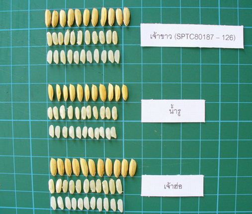 เมล็ดข้าวเปลือก ยาว x กว้าง x หนา = 10.0 x 3.1 x 2.4 มิลลิเมตร |