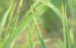 ด้วงหมัดจุด Monolepta signata Olivier ตัวเต็มวัยเป็นแมลงปีกแข็ง ขนาดประมาณ 4 มิลลิเมตรโตกว่าด้วงหมัดดำเล็กน้อย ส่วนหัวและอกสีเหลืองส้ม ปีกคู่หน้าสีน้ำตาลหรือน้ำตาลเข้ม บริเวณโคนและปลายปีกคู่หน้าซึ่งคลุมส่วนหน้าท้อง มีจุดใสสีขาวหรือขาวซีดขนาดใหญ่เห็นได้ชัด ข้างละ 2 จุด ทำลายข้าวไร่ในระยะเป็นต้นกล้าและแตกกอ มักจะพบด้วงหมัดจุดพร้อมๆ กับด้วงหมัดดำในแปลงปลูกข้าวไร่ เป็นแมลงศัตรูที่มีความสำคัญค่อนข้างน้อย และยังไม่พบความเสียหายรุนแรงจากการทำลายของด้วงหมัดจุด การทำลายข้าวไร่ในระยะเป็นต้นกล้าและแตกกอ ใบข้าวด้านบนถูกแทะกัดกินผิวใบเหลือแต่เส้นใบเป็นทางยาว ถ้ามีการระบาดมากในระยะเริ่มแตกกอ ต้นข้าวจะเจริญเติบโตช้าและแตกกอน้อย พบแพร่กระจายตามแหล่งปลูกข้าวไร่ทั่วไป และจำนวนแมลงที่พบมีไม่มาก