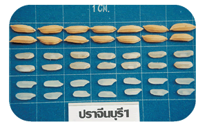 เมล็ดข้าวเปลือก ยาว x กว้าง x หนา = 10.6 x 2.8 x 2.1 มิลลิเมตร
