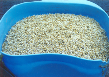 5. นำเมล็ดข้าวจากข้อ 3 โรยลงในถาดเพาะ อัตรา 200 กรัม ต่อถาดเพาะ