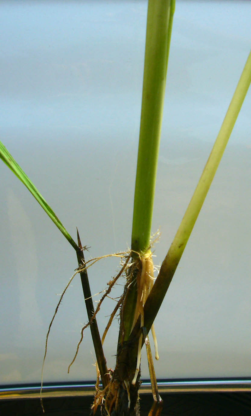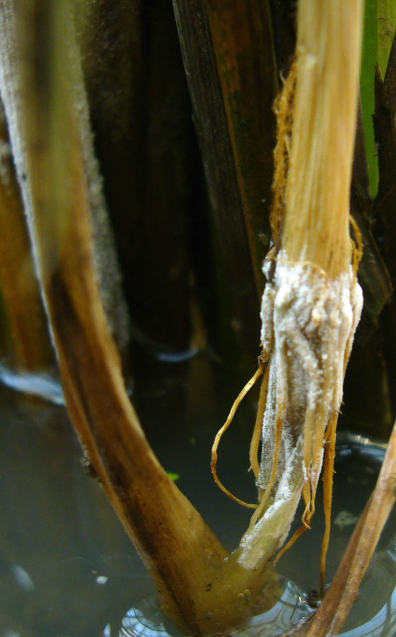 โรคถอดฝักดาบ (Bakanae Disease)พบทั่วทุกภาคของประเทศไทย สาเหตุ เชื้อรา Fusarium fujikuroi Nirenberg (Fusarium moniliforme J. Sheld) อาการ พบโรคในระยะกล้าถ้าอาการรุนแรง ถ้าอาการรุนแรงต้นกล้าจะแห้งตาย แต่มักพบกับข้าวอายุเกิน 15 วัน ระยะเริ่มแตกกอ ข้าวเป็นโรคจะต้นผอมสูงเด่นกว่ากล้าข้าวโดยทั่ว ๆ ไป ต้นข้าวผอมมีสีเขียวอ่อนซีด มักย่างปล้อง บางกรณีข้าวจะไม่ย่างปล้อง แต่รากจะเน่าช้ำเวลาถอนมักจะขาดตรงบริเวณโคนต้น หากไม่รุนแรงอาการจะแสดงหลังจากย้ายไปปักดำได้ 15-45 วัน โดยที่ต้นเป็นโรคจะสูงกว่าข้าวปกติ ใบมีสีเขียวซีด เกิดรากแขนงที่ข้อลำต้นตรงระดับน้ำ บางครั้งพบกลุ่มเส้นใยสีชมพูตรงบริเวณข้อที่ย่างปล้องขึ้นมา ต้นข้าวที่เป็นโรคมักจะตายและมีน้อยมากที่อยู่รอดจนถึงออกรวง ![]() ลักษณะต้นข้าวเป็นโรคถอดฝักดาบ เชื้อราที่ข้อของต้นข้าวที่เป็นโรคถอดฝักดาบ