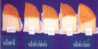 6. ขนมเค้ก แป้งข้าวที่เหมาะสมสำหรับทำเค้กแทนแป้งสาลี 100% ควรเป็นแป้งอมิโลสต่ำที่ได้จากการโม่แห้ง ทั้งนี้ ควรเติม SP ซึ่งเป็น emulsifier เพื่อช่วยการขึ้นฟู แป้งชนิดโม่น้ำสามารถทดแทนแป้งสาลีได้ 80% แป้งชนิดโม่น้ำไม่เหมาะสำหรับทำเค้ก เพราะชิ้นเค้กจะยุบตัวลง