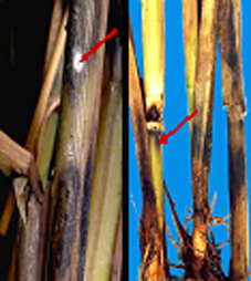พบมาก ใน นาน้ำฝน และ นาชลประทาน ใน ภาคกลาง ภาคเหนือ ภาคตะวันออกเฉียงเหนือ และ ภาคใต้ สาเหตุ เชื้อรา Sclerotium oryzae Catt. อาการ เริ่มพบอาการได้ในระยะต้นข้าวก่อนออกรวงหรือหลังออกรวงแล้ว โดยจะพบแผลเป็นจุดสีน้ำตาลดำใกล้ระดับน้ำและแผลจะขยายใหญ่ขึ้นและลงตามกาบใบของต้นข้าว และในขณะเดียวกันภายในลำต้นก็จะมีแผลมีลักษณะเป็นขีดสีน้ำตาล เมื่อต้นข้าวเป็นโรครุนแรง ใบล่างของต้นข้าวเปลี่ยนเป็นสีเหลือง ส่วนของกาบใบและลำต้นจะเน่า ต้นข้าวล้มง่ายและเมื่อดึงต้นข้าวก็จะหลุดออกจากกอได้ง่าย ต้นข้าวจะตายก่อนออกรวง แต่ถ้ามีการระบาดของโรคไม่รุนแรงหรือโรคเกิดขึ้นในระยะต้นข้าวหลังออกรวงแล้ว จะมีผลทำให้ผลผลิตของข้าวลดลงได้ และเมื่อต้นข้าวเป็นโรคและแห้งตายก็จะพบเม็ดขยายพันธุ์ของเชื้อราสาเหตุของโรคมีสีดำฝังอยู่ในเนื้อเยื่อของกาบใบและตามปล้องของต้นข้าว เม็ดขยายพันธุ์ของเชื้อราสาเหตุของโรคสามารถตกค้างอยู่บนตอซังข้าวและในดินได้เป็นระยะเวลานาน