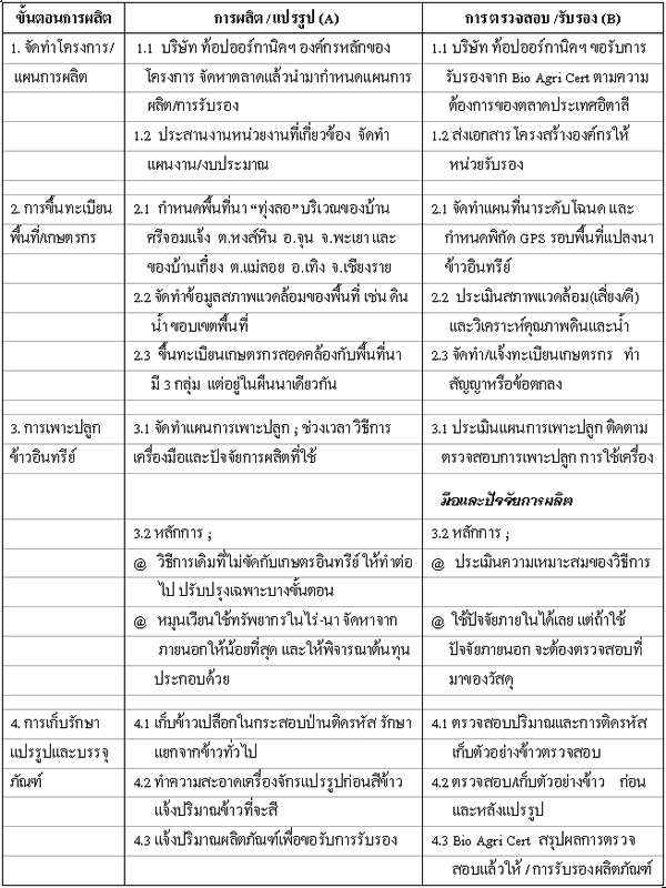 | เปรียบเทียบการผลิตข้าวโดยทั่วไปกับการผลิตข้าวอินทรีย์ รูปแบบการผลิตข้าวอินทรีย์ great harvest และ ไทไท ประกอบด้วย ด้านการผลิต : ฝ่ายผลิต(production part) การจัดทำโครงการ กำหนดผู้เกี่ยวข้อง สมัครขอรับการรับรอง กับหน่วยรับรองที่ผู้ซื้อต้องการกำหนดและขึ้นทะเบียนพื้นที่ ทะเบียนเกษตรกร และการจัดการสภาพแวดล้อม กำหนดแผนการเพาะปลูก จนได้ข้าวเปลือก การรวบรวมผลผลิต เก็บรักษา แปรรูป บรรจุผลิตภัณฑ์ และวางตลาด ทุกขั้นตอน มีการจัดทำเอกสารส่งให้หน่วยรับรอง ด้านการตรวจสอบ : วางแผนการตรวจสอบ โดยกำหนดผู้ตรวจในแต่ละขั้นตอน ตรวจประเมิน วิเคราะห์ สัมภาษณ์ และสอบทวนทุกขั้นตอนการตรวจสอบ มีเอกสารรายงานผลกำกับ ส่งเอกสารรายงานทุกขั้นตอน ให้หน่วยรับรอง ด้านการรับรอง : หน่วยรับรอง(certify body ) พิจารณาเอกสารรายงาน ทั้งจากด้านการผลิต และด้านการตรวจสอบ แล้วสรุปผลว่า จะให้หรือไม่ให้การรับรองผลผลิตหรือผลิตภัณฑ์ที่ได้จากรอบการผลิตนั้น กรณีตัวอย่าง(prototype)การผลิตข้าวอินทรีย์great harvest และ ไทไท เปรียบเทียบการผลิตข้าวโดยทั่วไป กับ การผลิตข้าวอินทรีย์
