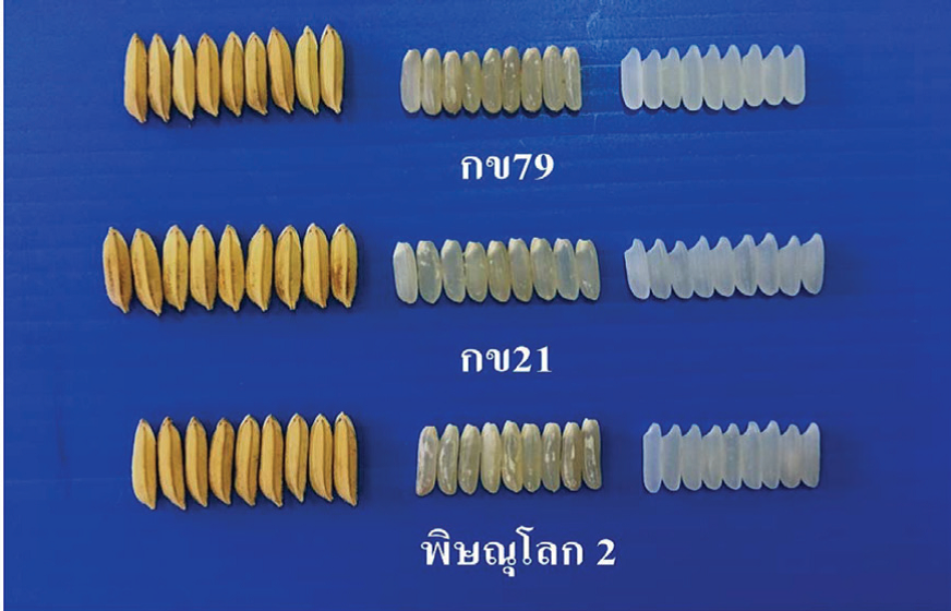 เมล็ดข้าวเปลือก ยาว x กว้าง x หนา = 10.50 x 2.58 x 2.02 มิลลิเมตร |