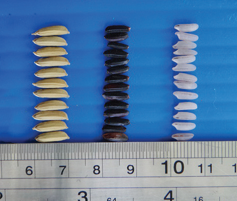 เมล็ดข้าวกล้องสีม่วงดำ ยาว x กว้าง x หนา = 7.32 x 2.41x 1.74 มิลลิเมตร |