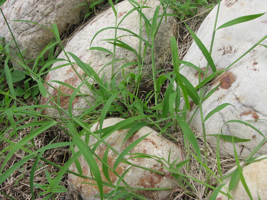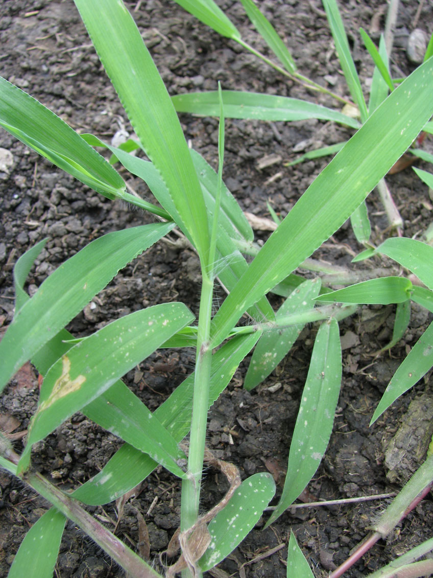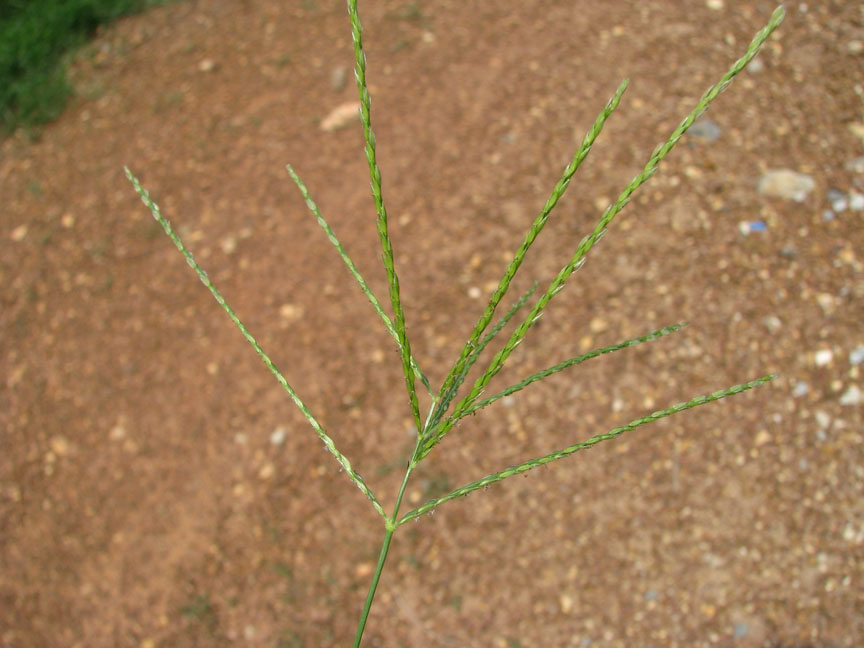 ลำต้นทอดไปกับพื้นและยกสูงขึ้นได้ประมาณ 30-50 เซนติเมตร กาบใบเกลี้ยง ลิ้นใบเป็นแผ่นยาว ช่อดอกมี 4-7 แขนง ช่อดอกย่อยซึ่งกระจายจากปลายโคนก้านลักษณะเหมือนพู่ โดยทั่วไปแล้วจะงอกพร้อมข้าว มักพบในที่รกร้างและริมถนน
