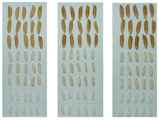 เมล็ดข้าวเปลือก ยาว x กว้าง x หนา = 7.5 x 2.5 x 1.8 มิลลิเมตร