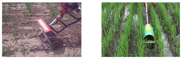 โดยเครื่องกำจัดวัชพืชเหล่านี้จะใช้ต้นกำลังจากแรงคนหรือเครื่องยนต์ก็ได้ ถ้าเป็นเครื่องยนต์ส่วนใหญ่จะเป็นเครื่องยนต์ขนาดเล็กขนาด 2-4 แรงม้า ใช้สำหรับตัดหญ้าหรือพรวนดินร่วมกันในระหว่างแถวและระหว่างต้นข้าว ถ้าใช้ต้นกำลังจากแรงคนจะใช้เครื่องกำจัดวัชพืชแบบพรวนแล้วดันเครื่องไปข้างหน้า