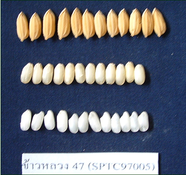 เมล็ดข้าวเปลือก ยาว x กว้างx หนา = 9.9 x 3.3 x 3.0 มิลลิเมตร |