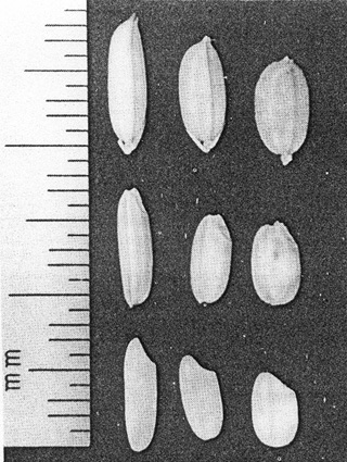 1.3 ขนาดของเมล็ด (Grain size) วัดจาก ความยาว กว้าง หนาของเมล็ด แต่ในการพิจารณาคุณภาพเมล็ดทั่วไปจะหมายถึงความยาวของเมล็ด มาตรฐานข้าวไทยกำหนดชั้นของเมล็ดเป็น 4 ขนาด เช่นเดียวกับมาตรฐานกำหนดชั้นของเมล็ดของสหรัฐอเมริกา แต่มีขนาดแตกต่างกัน ชั้นของเมล็ดข้าวตามมาตรฐานข้าวไทยและสหรัฐอเมริกา