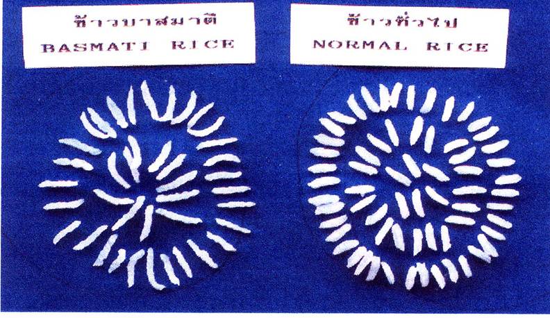 4.4 การยืดตัวของเมล็ดข้าวสุก (Elongation ratio during cooking) ในระหว่างการหุงต้มเมล็ดข้าวมีการขยายตัวทุกด้าน โดยเฉพาะด้านยาว คุณลักษณะนี้เป็นคุณภาพพิเศษของข้าว ซึ่งจะช่วยเสริมให้เมล็ดข้าวสุกขยายมากขึ้น และหากข้าวสุกไม่เหนียวติดกันการขยายของข้าวสุกจะช่วยให้ข้าวขึ้นหม้อดีขึ้น ช่วยให้ข้าวนุ่มมากขึ้น เพราะการขยายตัวทำให้เนื้อข้าวโปร่งไม่อัดแน่น ด้วยเหตุนี้ ข้าวบาสมาติ 370 ซึ่งเป็นข้าวอมิโลสปานกลาง แต่มีการยืดตัวดีมากจึงเป็นที่นิยมในตะวันออกกลาง