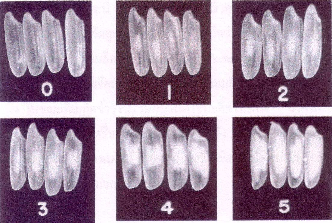 4.3 ระยะเวลาในการหุงต้ม (Cooking time) การต้มเมล็ดข้าวให้สุกใช้เวลาแตกต่างกัน ขึ้นอยู่กับอุณหภูมิแป้งสุก (gelatinization temperature) การประเมินหาอุณหภูมิแป้งสุก โดยวิธีการสลายเมล็ดข้าวในด่าง (alkali test) โดยแช่เมล็ดข้าวสารในสารละลายด่างโพแทสเซียมไฮดรอกไซด์ (KOH) 1.7% นาน 23 ชั่วโมง และใช้ค่าการสลายของเมล็ดที่ปรากฏ มาประเมินระดับอุณหภูมิแป้งสุกได้ดังนี้