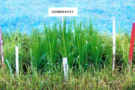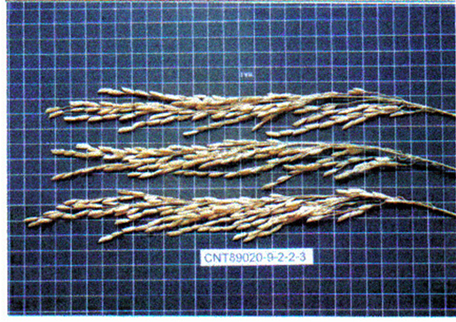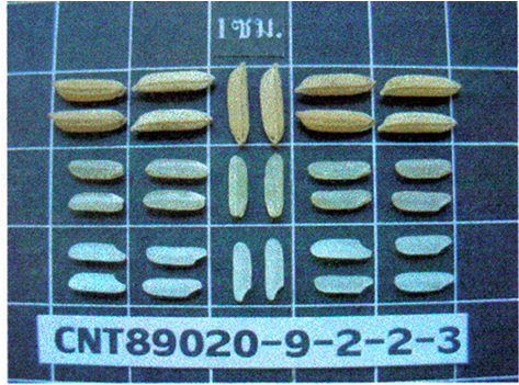 พันธุ์สุพรรณบุรี 60 และ IR60 กับ IR64 ที่สถานีทดลองข้าวชัยนาท ในฤดูนาปี พ.ศ. 2532 ปลูกคัดเลือกจนได้สายพันธุ์ CNT89020-9-2-2-3 |
