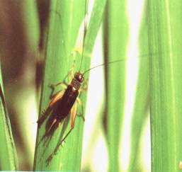 จิ้งหรีดหนวดยาว M. vittaticolis Stal ตัวเต็มวัยขนาดยาวประมาณ 6 มิลลิเมตร โคนหนวด 2 ปล้องแรกสีดำ มีหนวดที่ยาว หัว อก ท้องและปีกมีสีดำ ส่วนของทิเบียและทาร์ไซของขาคู่หน้าและคู่กลางสีดำ ขาส่วนอื่นๆ สีขาวนวล เป็นตัวห้ำกินไข่ผีเสื้อหนอนกอและแมลงศัตรูข้าวอื่นๆ พบในนาข้าวตั้งแต่ฤดูปลูก เกาะไต่อยู่ตามต้นข้าว สามารถบินได้