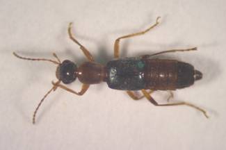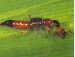 ด้วงก้นกระดก P. fuscipes Curtis ตัวเต็มวัยยาวประมาณ 5-6 มิลลิเมตร โคนหนวดสีน้ำตาลแดง ส่วนปลายสีน้ำตาลดำ มีขนตามปล้องหนวด หัวแบนสีดำ อกส่วนหน้าแบนยาว สีน้ำตาลไหม้ ปีกสีดำและมีขนสั้นๆ ขาทั้ง 3 คู่ สีน้ำตาลแดง ส่วนท้องมี 6 ปล้อง 4 ปล้องแรกสีน้ำตาล ส่วนที่เหลือสีดำ บินเร็วและว่องไว เวลาวิ่งจะยกปลายท้องตั้งขึ้นคล้ายแมงป่องจนเรียกว่า “ด้วงก้นกระดก” เป็นตัวห้ำของตัวอ่อนและตัวเต็มวัยเพลี้ยกระโดดและเพลี้ยจักจั่น หนอนและดักแด้หนอนผีเสื้อกินใบ และไข่ของหนอนกอ พบทั่วไปในนาข้าว ทุกระยะการเจริญเติบโตของต้นข้าว เป็นแมลงที่มีอายุอยู่ได้ยาวนาน มีความว่องไว ไต่ไปตามต้นข้าว และบินได้