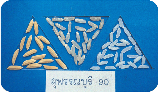 เมล็ดข้าวเปลือก ยาว x กว้าง x หนา = 10.1 x 2.7 x 2.0 มิลลิเมตร