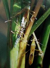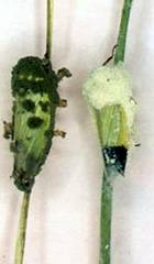 เชื้อราเขียว M. anisopliae var anisopliae Tulloch. ลักษณะเป็นรูปทรงกระบอก เส้นใยมีผนังกั้นเป็นปล้องๆ ไม่มีสี เส้นใยแผ่ขยายเจริญเติบโตสร้างสปอร์(conidia) เป็นรูปยาวรีคล้ายเมล็ดข้าว เป็นลูกโซ่ต่อกันตรงรอยคอคอด เรียก conidium แต่ละ conidium ที่เกิดใหม่มีสีขาว ต่อมาเปลี่ยนเป็นสีเขียวคล้ำ ซึ่งเป็นชื่อเรียกของเชื้อราชนิดนี้ ปรกติจะเกิดโรคกับเพลี้ยกระโดด เพลี้ยจักจั่น แมลงหล่า แมลงสิง และแมลงศัตรูข้าวอื่นๆ