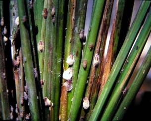 เชื้อราขาว B. bassiana (Balsamo) Vuillemin สปอร์เป็นรูปทรงกลม ก้านชูสปอร์เป็นเส้นยาว เรียงเป็นสายเดี่ยว หรือแตกเป็นกิ่งก้านรวมกันคล้ายรูปจาน เส้นใยทรงกระบอกเส้นผ่าศูนย์กลาง 1.5-2.0 ไมครอน สีใส มีผนังกั้น การทำลายแมลงเกิดจากเชื้อราเมื่อเข้าสู่ตัวแมลงจะสร้างสารพิษ Beauvericin ทำลายเนื้อเยื่อและระบบต่างๆ ของแมลง ทำให้แมลงตายอย่างรวดเร็วเมื่อเชื้อราสร้างเส้นใยจนเต็มตัวแมลง แมลงจะนิ่งอยู่กับที่ เชื้อราก็จะสร้างเส้นใยแทงผ่านลำตัวแมลงออกมาภายนอก เพื่อสร้างสปอร์ไว้ขยายพันธุ์ต่อไป แมลงที่ตายเพราะเชื้อรา ลำตัวมักจะแห้งแข็งและมีเส้นใยและสปอร์ปกคลุมทั่วตัว เรียกลักษณะนี้ว่า มัมมี่