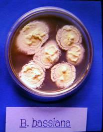 เชื้อราขาว B. bassiana (Balsamo) Vuillemin ที่เลี้ยงบนอาหารเลี้ยงเชื้อ |