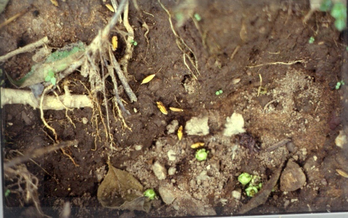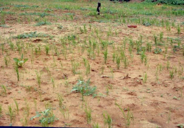ลักษณะการทำลาย มดง่าม เป็นแมลงศัตรูที่สำคัญที่สุดของข้าวไร่ ทำให้เกิดปัญหาในระยะหยอดหรือโรยเมล็ด เมื่อเกษตรกรหยอดหว่านหรือโรยเมล็ดพันธุ์ข้าวไร่ลงในดิน มดง่าม จะขนเมล็ดข้าวนำไปเป็นอาหารหรือเก็บสะสมเป็นอาหารในรังใต้ดิน และขนเปลือกเมล็ดข้าวที่เนื้อข้าวถูกกินเป็นอาหารหมดแล้ว ออกทิ้งนอกรัง ทำให้สูญเสียเมล็ดพันธุ์ข้าวที่ใช้ปลูก ก่อปัญหาด้านจำนวนต้นต่อพื้นที่ และการซ่อมเมล็ด ซึ่งไม่นิยมทำกัน เพราะเวลาการปลูกมีจำกัด การงอกและเจริญเติบโตจะไม่เท่ากัน เป็นปัญหาในการดูแลรักษา บางครั้งต้องทำการปลูกใหม่อีกครั้ง และประการสำคัญ คือ การขาดแคลนเมล็ดพันธุ์ที่มีจำกัดหาได้ยาก ผลผลิตจะลดลงอย่างเห็นได้ชัด พบทั่วไปตามแหล่งปลูกข้าวไร่ทุกภาค ระหว่างเดือนเมษายน – พฤษภาคม ซึ่งเป็นระยะเริ่มปลูกข้าวไร่ การป้องกันกำจัด 1. เพิ่มอัตราเมล็ดพันธุ์ให้มากขึ้น เพื่อทดแทนการสูญเสียจากมดง่าม |