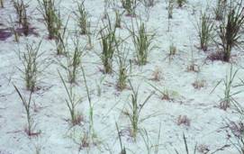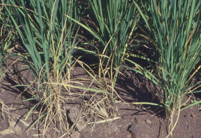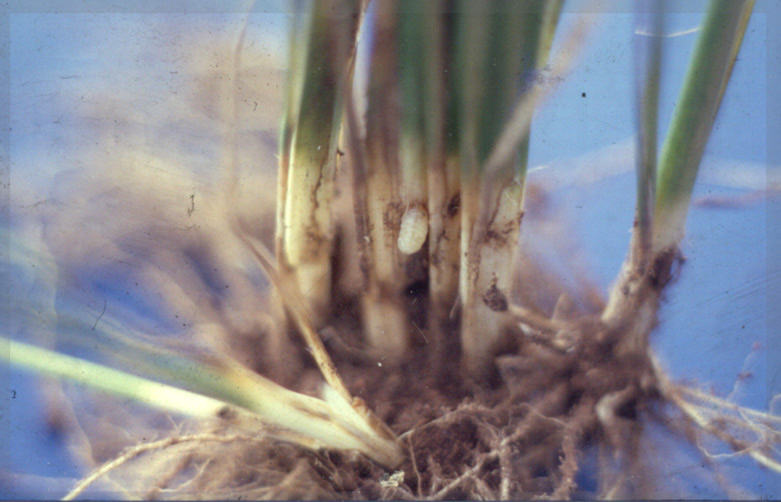 ลักษณะการทำลาย แมลง ค่อมทอง เป็นแมลงศัตรูข้าวไร่ที่สำคัญที่สุดชนิดหนึ่ง พบระบาดทำลายข้าวไร่ตามแหล่งปลูกทั่วไป ทำลายต้นข้าวได้ทุกระยะการเจริญเติบ โต โดยกัดกินส่วนลำต้นใต้ผิวดิน บางครั้งพบกัดกินอยู่กลางกอข้าวในดิน ส่วนของต้นข้าวระยะเริ่มถูกทำลายมีสีเหลืองซีด ต่อมาส่วนนั้นจะแห้ง บางครั้งพบแห้งตายทั้งต้นในกอหรือแห้งตายทั้งกอ ข้าวในระยะต้นกล้าและแตกกอใหม่ๆ ถูกกัดกินและเสียหายมากที่สุด ก่อปัญหาด้านจำนวนต้นต่อพื้นที่และการซ่อมกล้าเช่นเดียวกับที่เกิดจากมด ง่าม ผลผลิตต่อไร่ลดลงอย่างเห็นได้ชัด พบในแหล่งปลูกข้าวไร่ทั่วไป ตั้งแต่เดือนพฤษภาคม-สิงหาคม ระยะกล้าถึงระยะแตกกอ การป้องกันกำจัด 1). จับตัวเต็มวัยที่บินมาเกาะตามต้นพืชที่เป็นอาหารในช่วงฝนแรก ระยะปลายเดือนเมษายน-ต้นพฤษภาคม โดยใช้สวิงรองใต้กิ่งหรือใต้ใบพืช แล้วเขย่า ตัวเต็มวัยจะตกลงในสวิง นำไปทำลายทิ้ง 2). ไถพรวน ควรทำหลาย ๆ ครั้ง เพื่อทำลายไข่หรือหนอนที่อยู่ใต้ดิน 3). ในสภาพที่การระบาดประจำและรุนแรงใช้สารฆ่าแมลงคลุกเมล็ด คาร์โบซัลแฟน (พอสซ์ 25% เอสที) อัตรา 40 กรัมต่อเมล็ดพันธุ์ข้าวไร่ 1 กิโลกรัม และนำไปปลูกทันที |